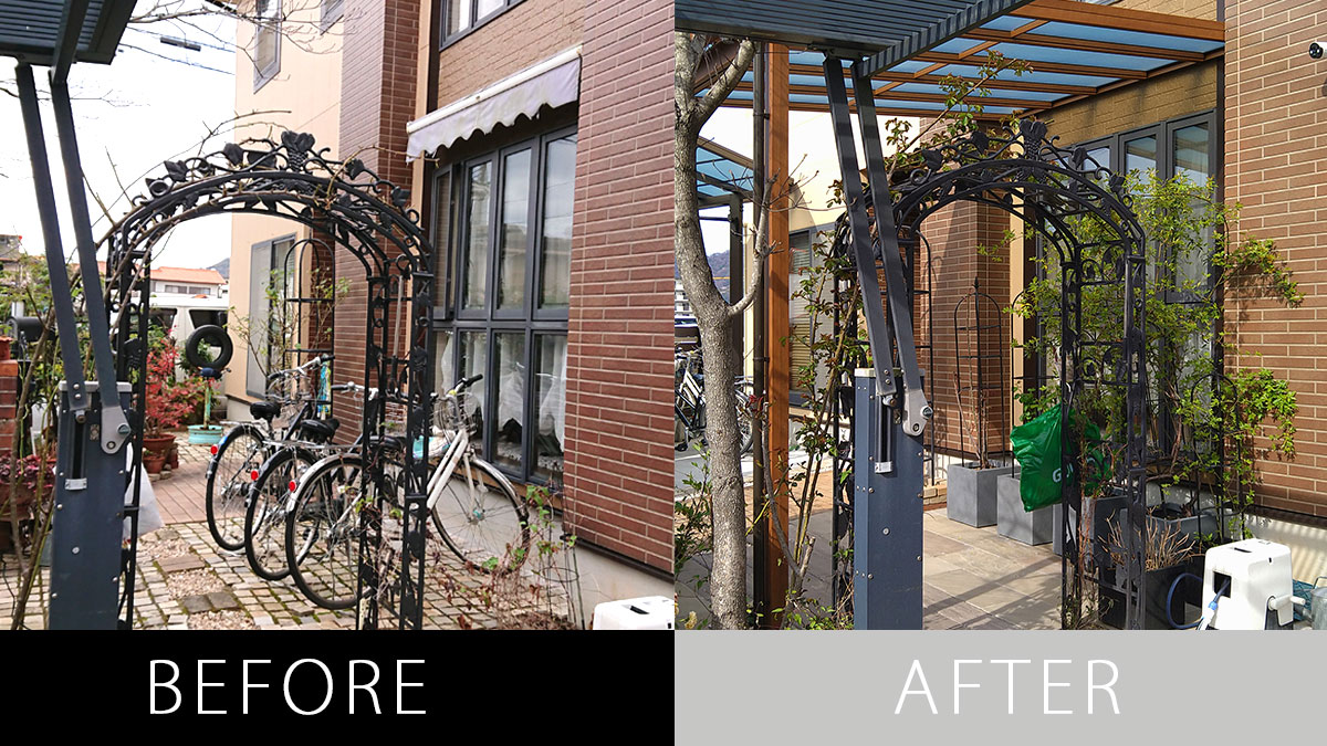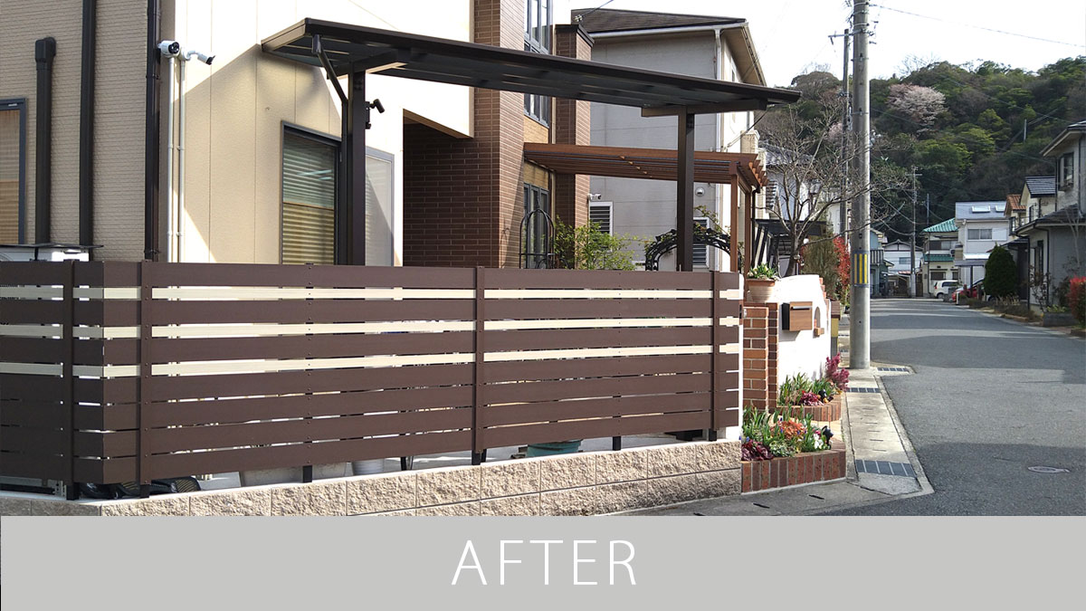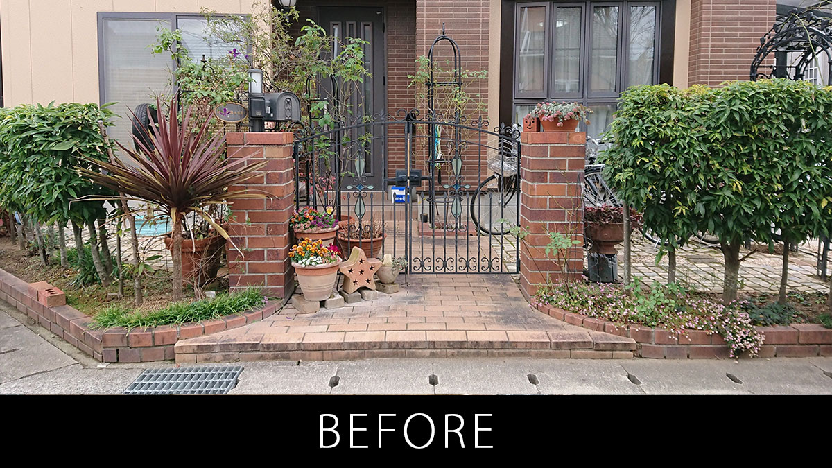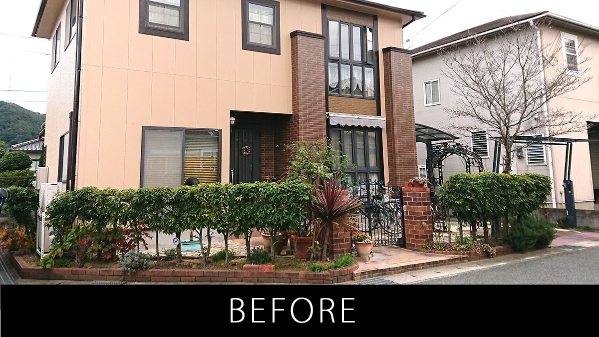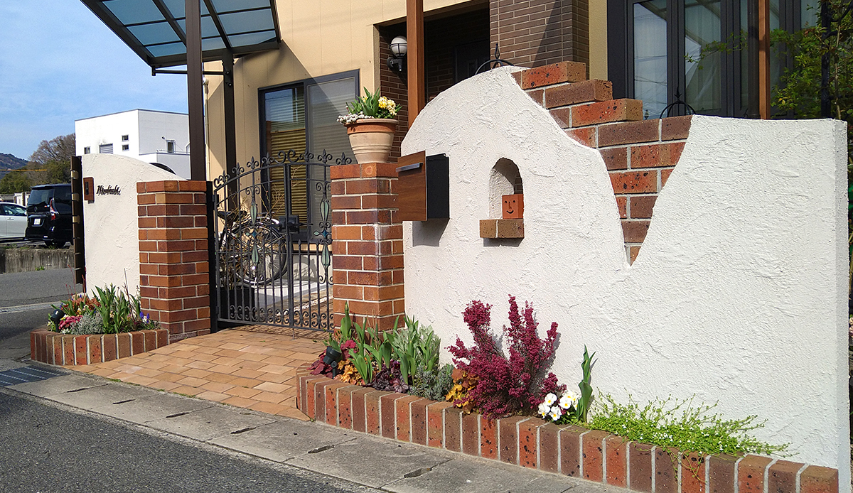 植栽を減らし、手入れがラクな外構にリフォーム 2024.06.03ナチュラル, リフォーム 植栽を減らし、手入れがラクなお庭へリフォーム 15年前に作った外構を、お子様が大きくなり使い勝手の良いお庭にリフォームしたいとのご依頼でした。 少し前までは道路側に生垣を植えることが主流な時代がありましたが、お手入れはかなり大変かと思います。 生垣を思い切って伐採し、フェンスに取り換えました。 目隠しが欲しいところは、しっかり目隠しできて高さもある木目調のフェンスに。 アプローチの段差を解消し、自転車の出し入れもスムーズに リフォーム前はアプローチ部分に段差があり、危険な上、自転車を入れる際は持ち上げる必要がありました。 そこで自転車を入れやすいように段差をなくし、フラットな状態にリフォーム。 もともと敷いてあったレンガを再利用することで廃棄物を減らし、SDGsにも配慮しました。 アプローチからスムーズに出し入れ可能な自転車置き場 これまで自転車置き場がなかったことで不便を感じていらっしゃっいました。 アプローチを内から自転車が入れやすいようにスロープに作りかえ、左側に新たに自転車置き場を作りました。 雨でも安心の屋カーポート屋根も設置しました。 目隠しフェンスにはブラウンの間にホワイト系のアクセントカラーを入れることで、暗くなりすぎずに家の色とも調和するようにデザインしました。 スペイン風にデザインしたアーチ化粧塀 もともとあった門扉と両サイドのレンガの柱はそのままに、両サイドには新たに化粧壁を造作しました。 アンティークっぽい雰囲気を出すために、塗り壁の間にレンガを埋め込み、わざと壁が裂けているようなデザインに。 壁には小窓も空いていて、キューブ型のかわいい顔のブロックが覗きます。 壁は白でラフに塗ることまるでスペイン料理店の雰囲気に。アンティーク感のある質感を出しました。 壁に埋め込んだポストはレンガと同系色の色を採用し、壁の後ろ側から取り出せます。 インターホンカバーも木目調のものを使用し、デザインを邪魔しない仕上がりとなりました。 ガーデニング好きの奥様がこれからも楽しめるように花壇も新しく作り直しました。使用したレンガはもともとあったものを有効活用しています。 オーニングをテラス屋根にすることでガーデニングを快適に リフォーム前は出し入れ可能なオーニングを設置されていましたが、木目調のテラス屋根にリフォーム。 ナチュラルな風合いを演出する木目調のテラスはアウトドアリビングとしてお茶やガーデニングを楽しめる場所となりました。 パネルには熱線遮断ポリカを使用し、木や花が弱るのを防ぎ、暑すぎる日のガーデニングでも快適にできるように配慮しました。 トータルで使いやすいお庭へとリガーデンが完成 ナチュラル, リフォーム ナチュラル, リフォーム 広々とした庭をナチュラルでスタイリッシュに 関連記事一覧 カーポート2台分を備えたナチュラルスタイル 広々とした庭をナチュラルでスタイリッシュに 北欧の赤いポストがかわいいナチュラルエクステリア